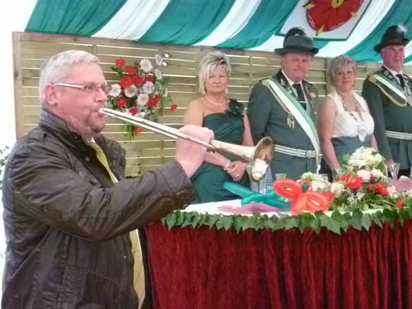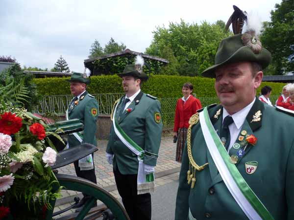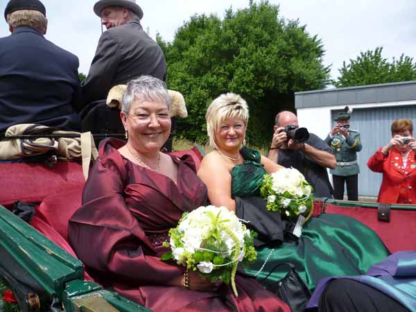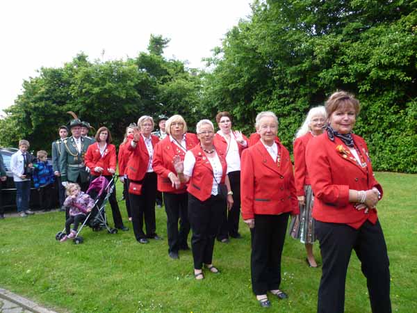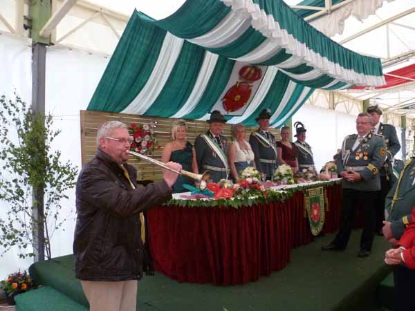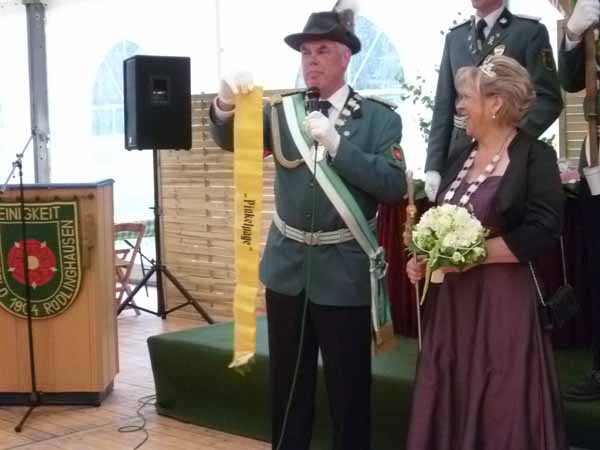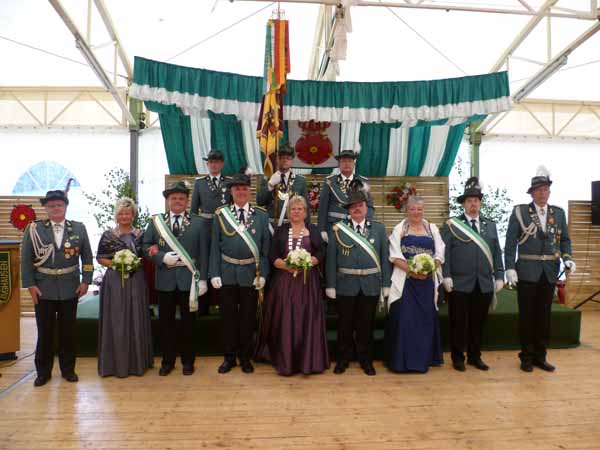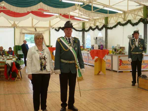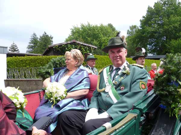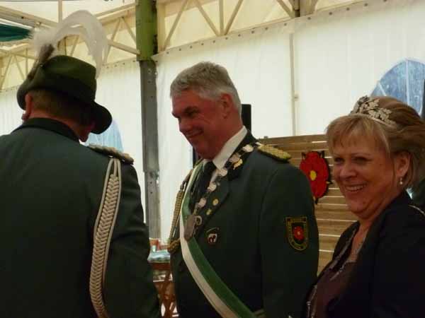 Am Samstag war das Wetter gut, die Abholung der Majestäten war immer eine große Freude. Die Inthronisierung klappte reibungslos. König Manfred I. hatte eine Überraschung parat: die Frauen des Thrones sollten nie alleine zur Toilette gehen! Es könnte zu Entführungen kommen. Das ist eine alte Tradition im Schützenwesen. Dann müsste "Lösegeld" gezahlt werden, um sie zurück zu bekommen. Es gibt jetzt eine Schärpe, die der Begleiter der Frauen trägt.