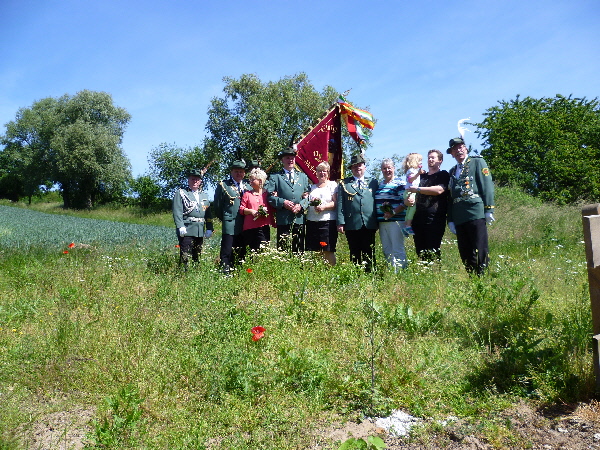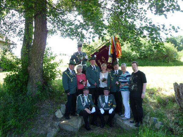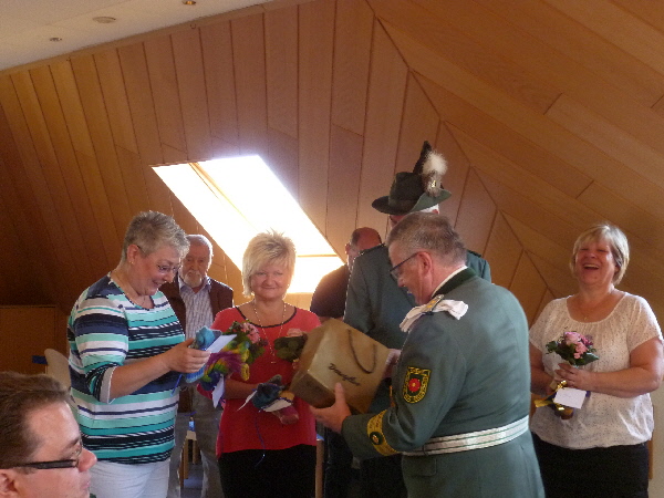 Ganz spontan sagte unser Schriftführer Tobias Redeker, er würde mitmachen. So waren alle Probleme gelöst. Die zukünftigen Thronherren entfernten sich, um sich die Uniform anzuziehen. Der 1. Vorsitzende, Heinrich Wallbaum, gratulierte allen. Er betonte, daß der Vereine eine Fürsorgepflicht gegenüber seinen Mitgliedern habe und er verteilte an den neuen Thron jedem ein Paar selbstgestrickte Socken. Nach den allgemeinen Gratulationen ging es zu Pressefotos in die Sonne.