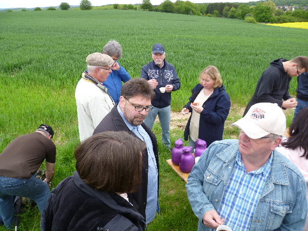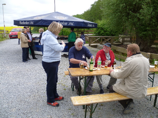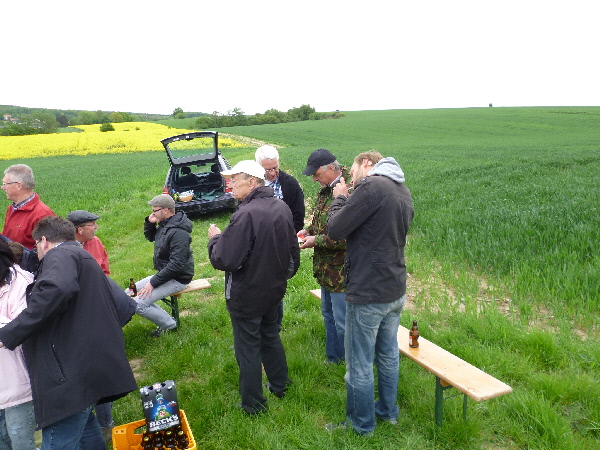 Die Schützenbrüder trafen sich am Vatertag am Wasserturm, um von hier aus ihren Wandertag zu beginnen. Das Frühstück, vom Thron wieder hervorragend vorbereitet, wurde auf freiem Gelände in der Nähe von Vahlhausen eingenommen. Es war immer noch kalt, aber trocken.