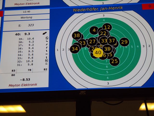 Das Schießen begann pünktlich und Jan Henrik legte mit dem zweiten Probeschuss eine saubere 10 hin (siehe Foto). In der Wertung lief es dann nicht ganz so gut für Jan Henrik. Der ein oder andere Fehlschuss haben ihm wertvolle Ringe gekostet. Am Ende belegte er mit 323 Ringen den 36. Platz. Das er zu mehr im Stande ist hat er bei den Bezirksmeisterschaften gezeigt. Hier belegte er mit 350 Ringen den 2. Platz.