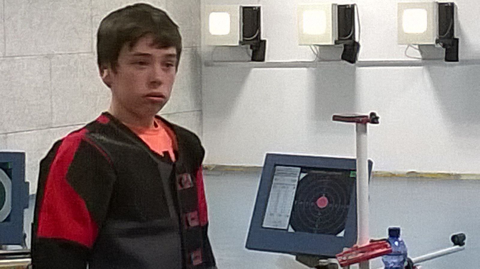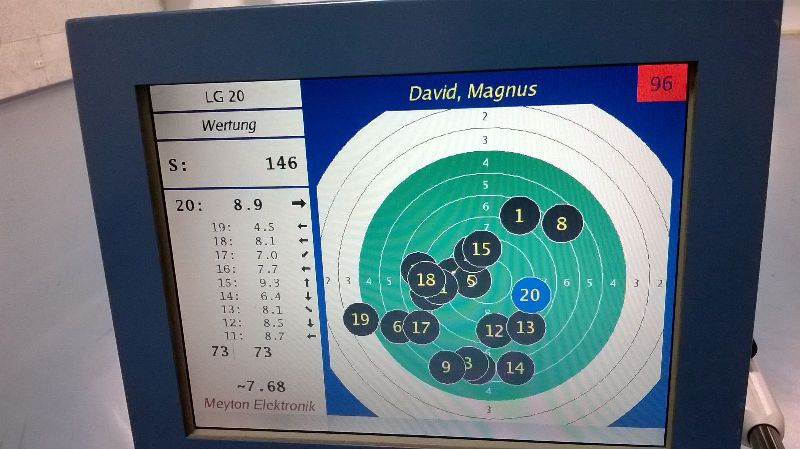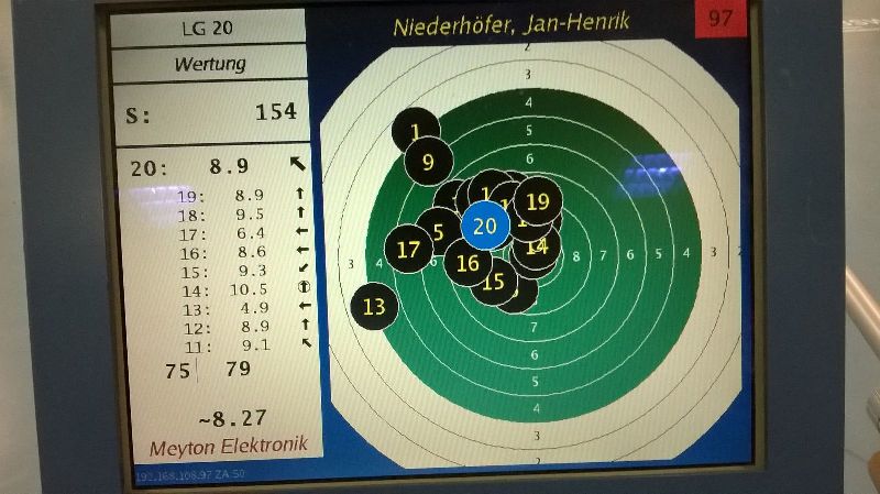 Die ersten Probeschüsse sind abgegeben. Der Jani sieht irgendwie gestresst aus. Er hat aber gerade eine 10 geschossen, ist auf dem Monitor zu sehen.
