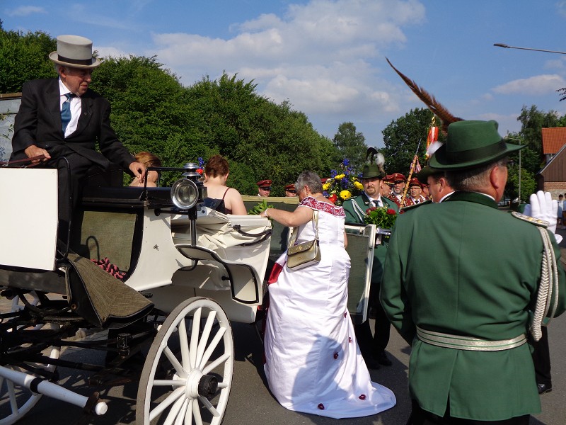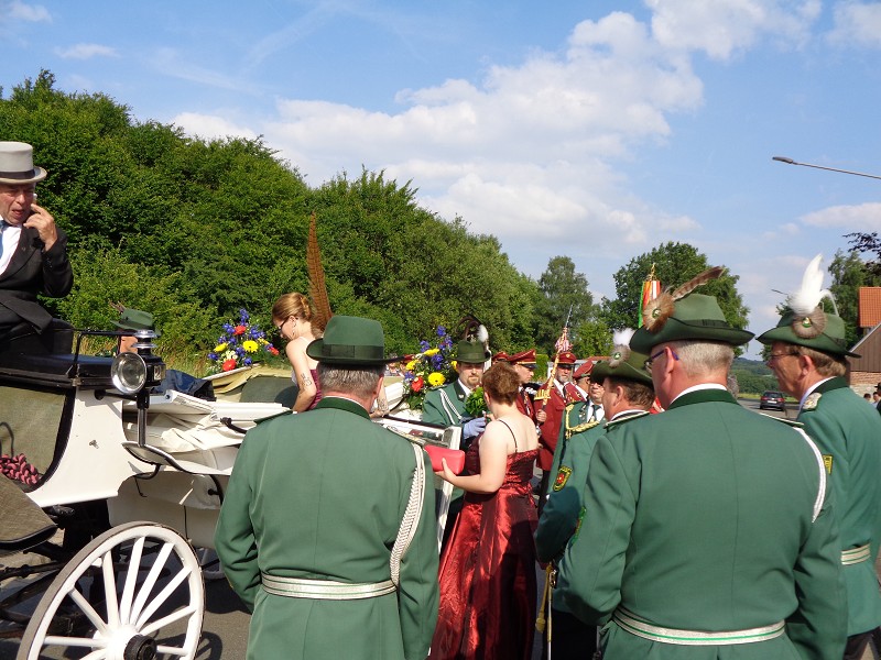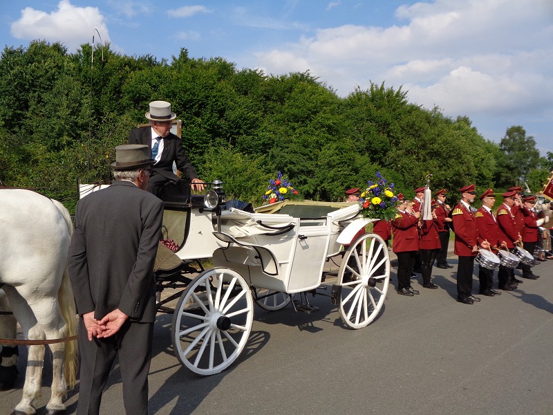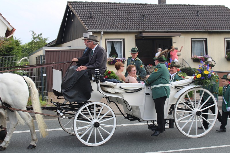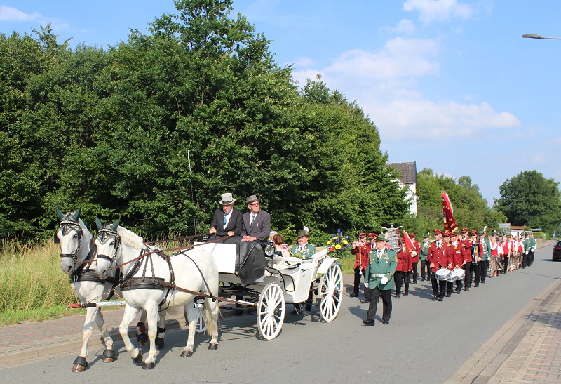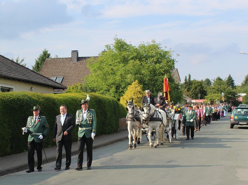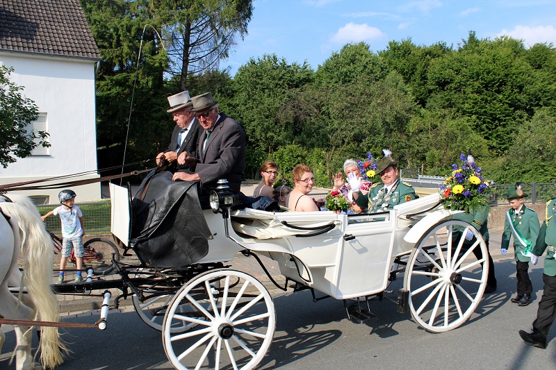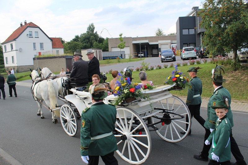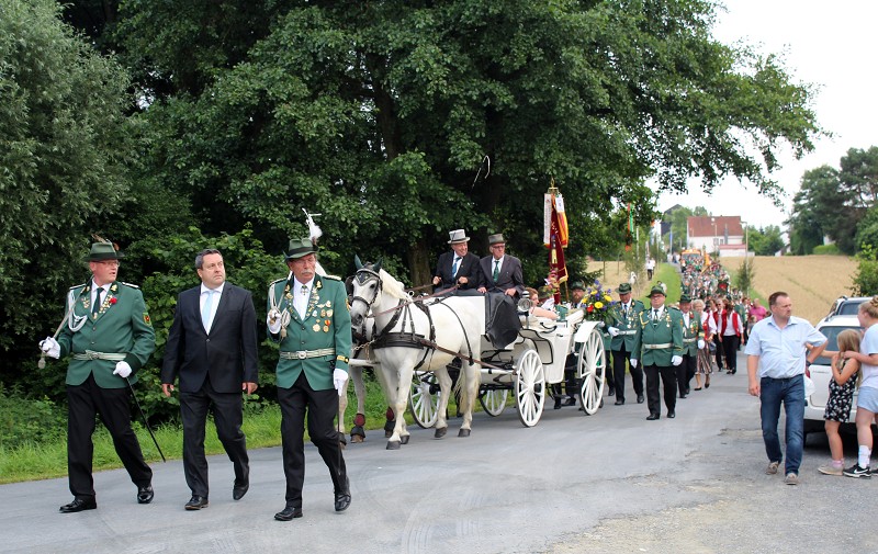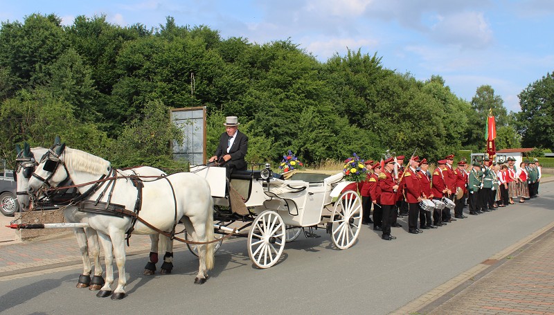 Mit einer weißen Kutsche ging der Rundmarsch mit den Gastvereinen, dem Beller Spielmannszug und der Marpetaler Blaskapelle zum Schützenplatz.