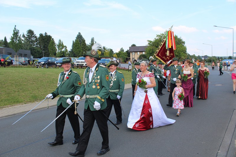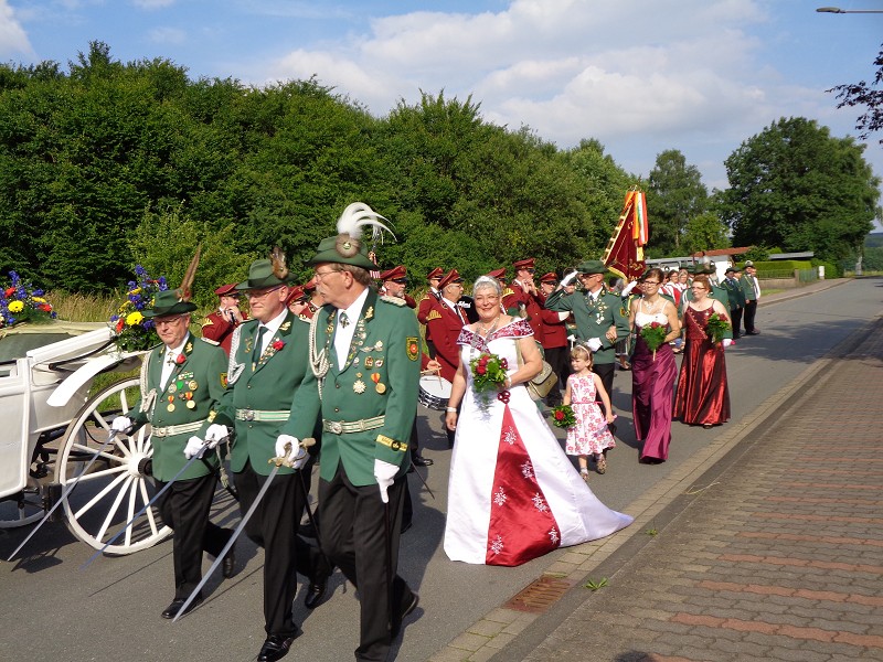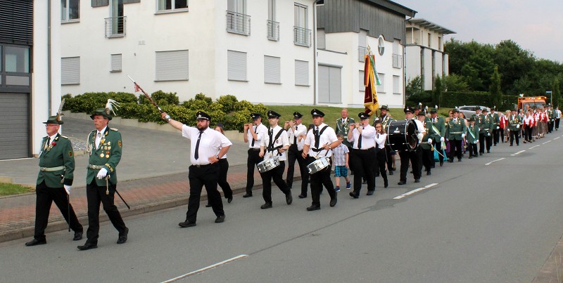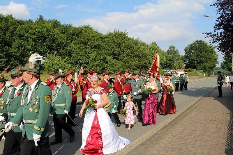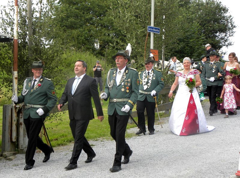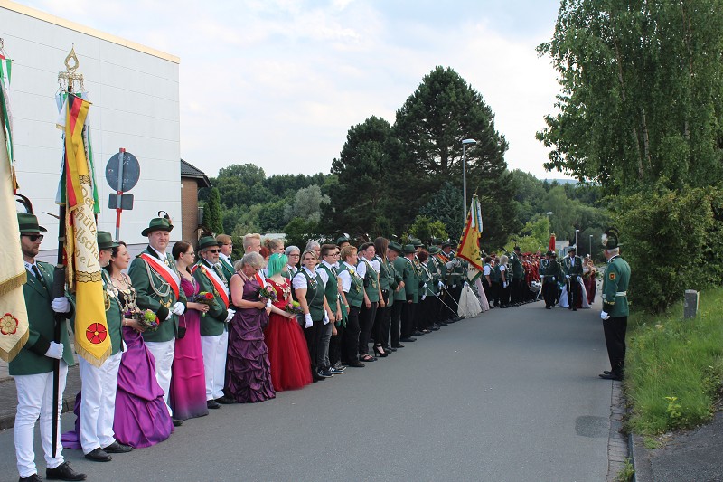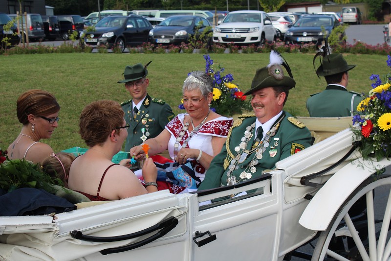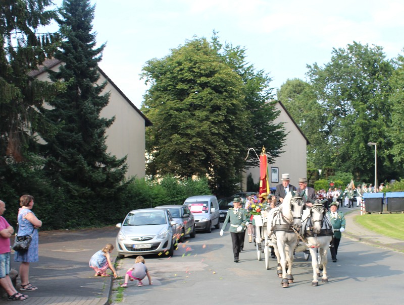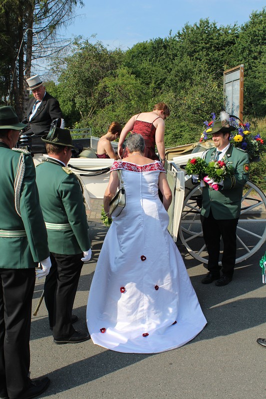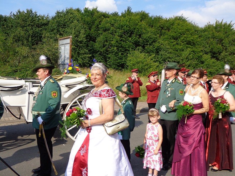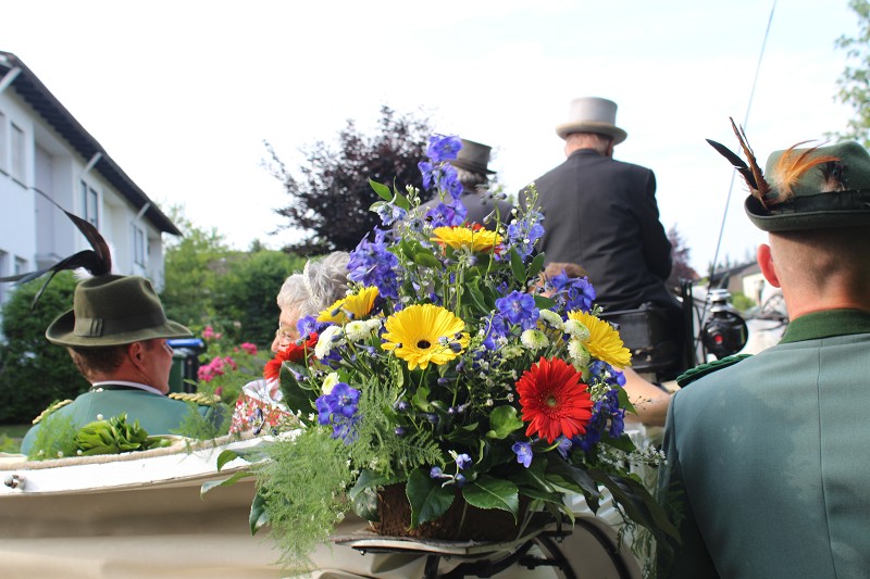 Mit einer weißen Kutsche ging der Rundmarsch mit den Gastvereinen, dem Beller Spielmannszug und der Marpetaler Blaskapelle zum Schützenplatz.