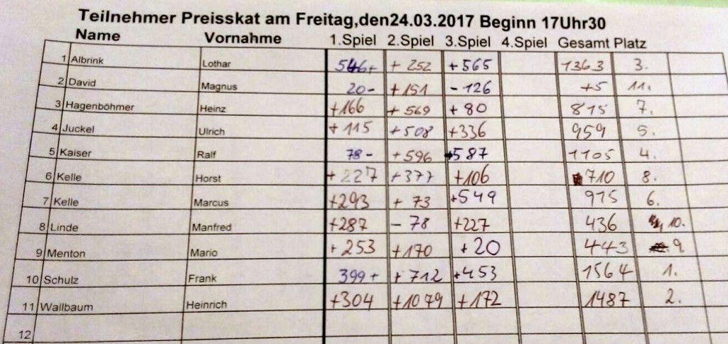 11 Teilnehmer versuchten Ihr Glück beim Skatabend.